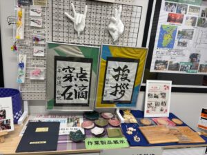 展示している作品は、生徒の皆さまが日々の授業や作業学習の中で制作した、木工製品や陶芸、紙工芸、布製品などの作品をご覧いただけます。